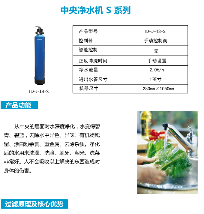 手動全屋中央凈水機有效去除水中的異色、異味;進一步濾除水中微小雜質(zhì)、膠狀體;去除水中的漂白粉余氯、農(nóng)藥、重金屬;保留對人體有益的礦物質(zhì)。使水變得碧清、碧藍,去除對人體有害的物質(zhì)。