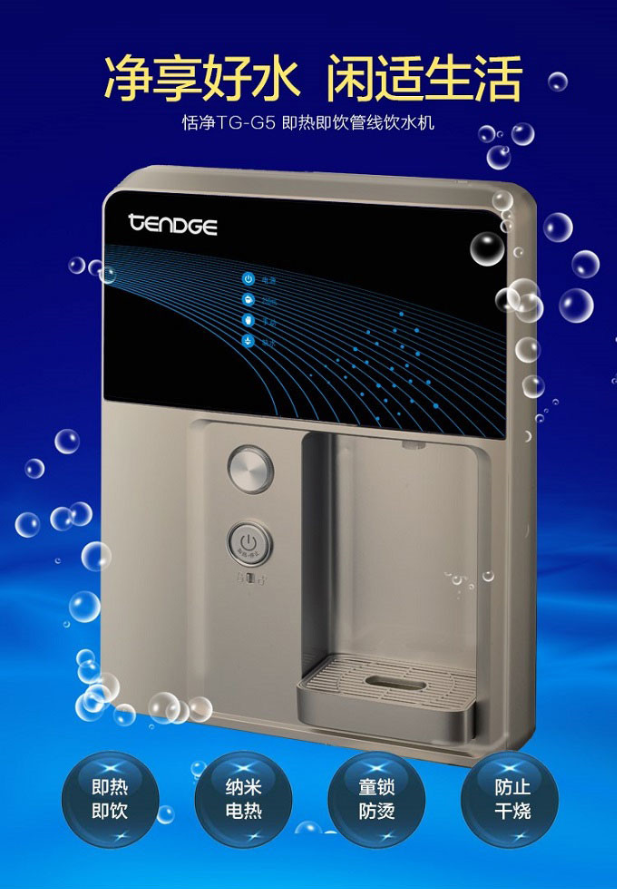 恬凈速熱管線飲水機TG-G5,采用納米電熱膜加熱技術(shù),有效殺死水中的細菌微生物,防治二次污染。3秒速熱,隨時可喝上熱水。恬凈速熱管線飲水機TG-G5自帶防干燒系統(tǒng)與童鎖,安全省心。