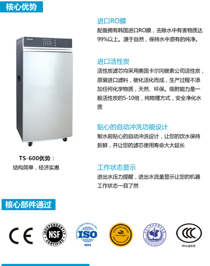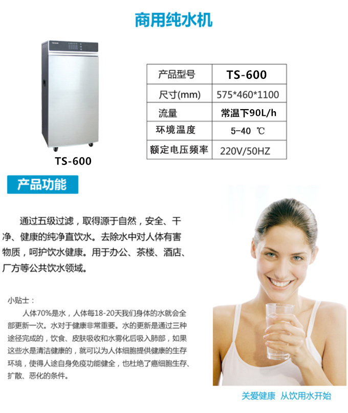 恬凈商用純水機可用于豪華別墅、辦公室、學(xué)校、茶樓等公共場所,解決公共飲水問題。恬凈商用純水機能夠去除水中所有有毒氣體及重金屬全部去除,水燒開再也不會結(jié)垢,口感甘甜,綿柔,讓飲用水更健康、更安全、更衛(wèi)生。
